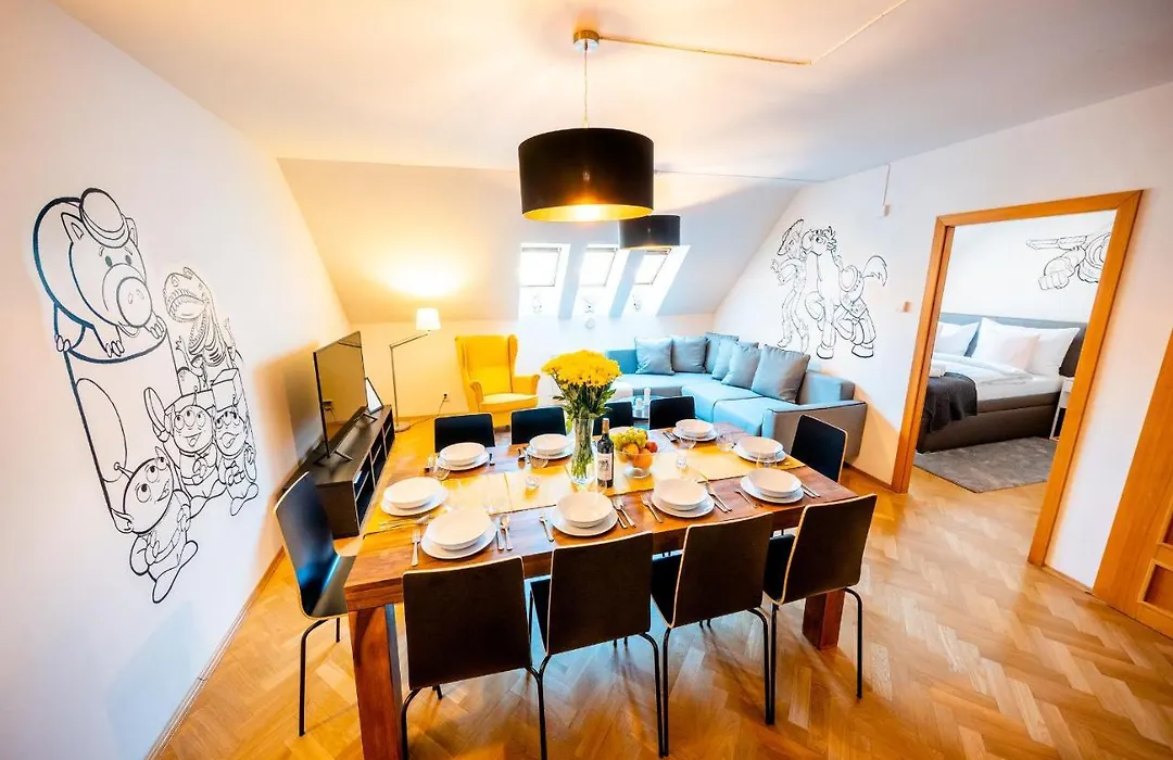 Klimentska Cartoon ferielejlighed ligger i Prag 01 område i Prag, 20 km fra Vaclav Havel lufthavn. Udstyret med et fuldt udstyret køkken med en mikrobølgeovn, en el-kedel og en opvaskemaskine, tilbyder indkvarteringen også et tekøkken, en spiseplads og et skrivebord på værelserne.
